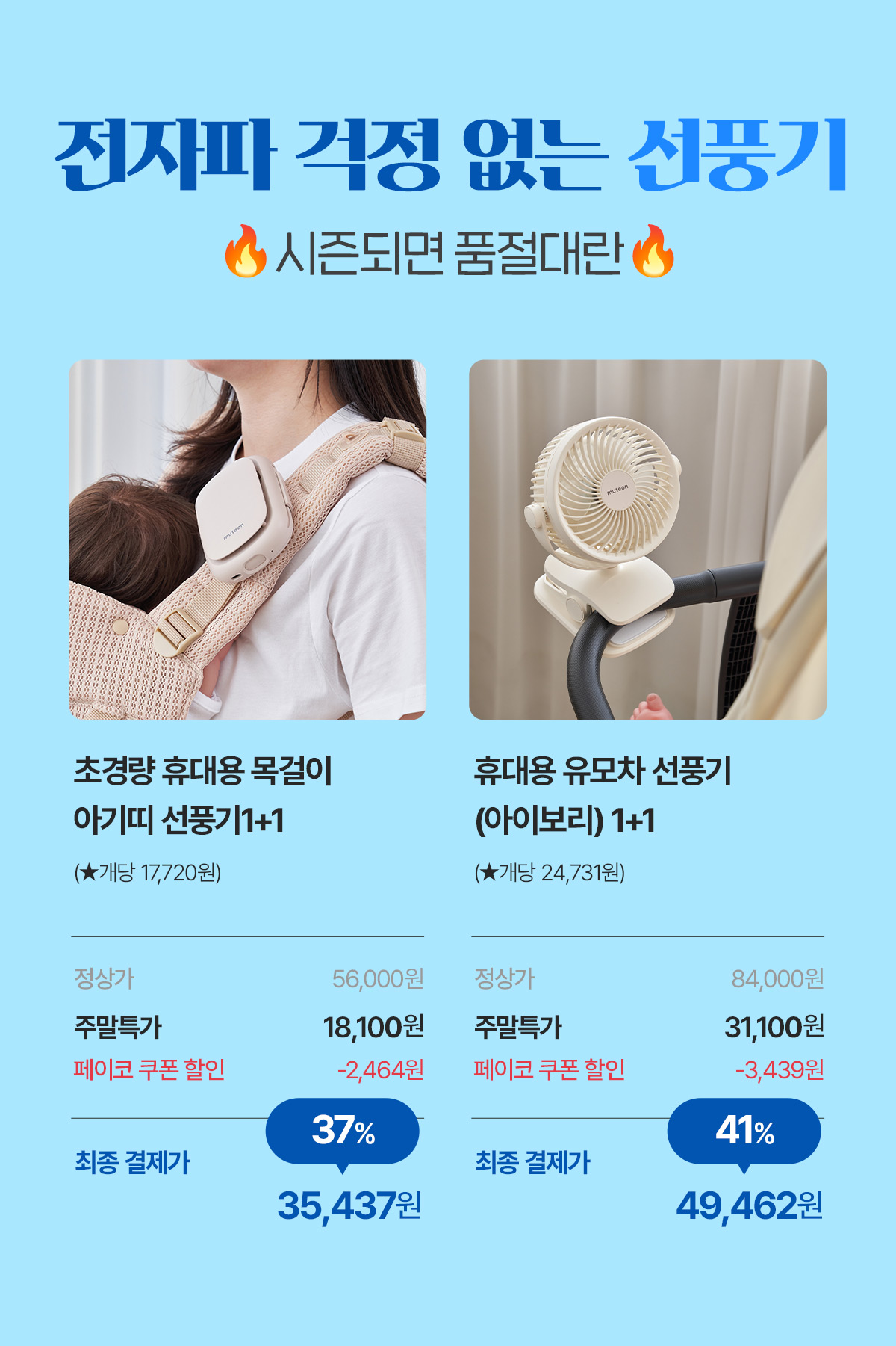 초경량 휴대용 목걸이 아기띠 선풍기 1+1