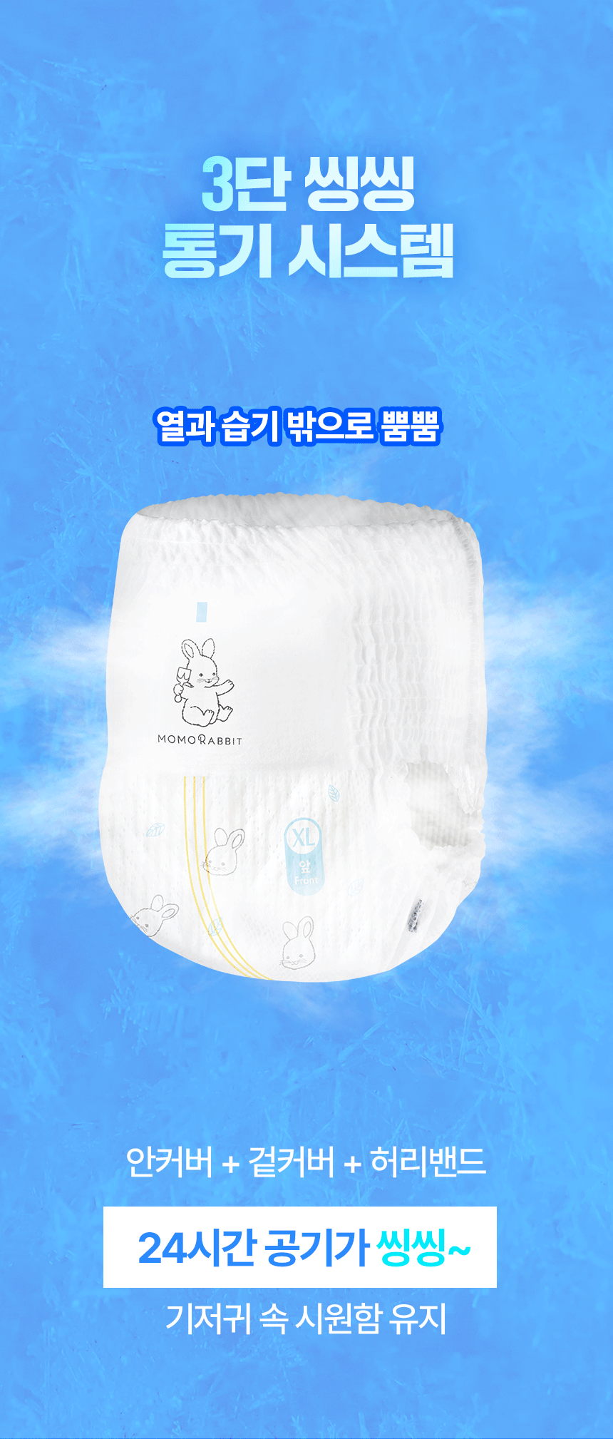 안커버, 겉커버 에어홀, 허리밴드 에어스루 원단을 적용한 3단 통기 구조로 기저귀안 열기와 습기를 빠르게 배출합니다.