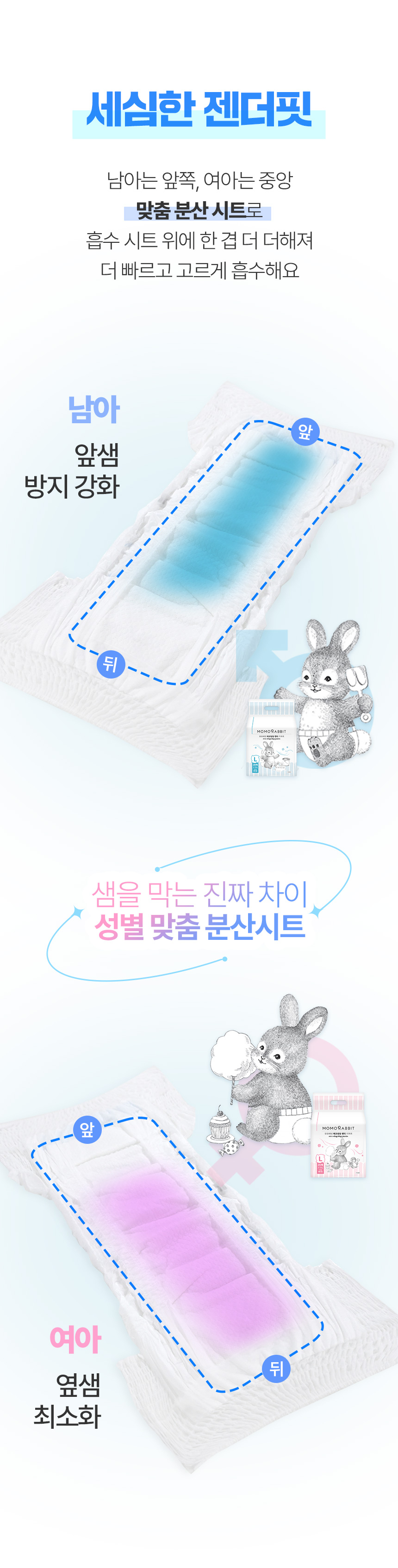 또한 남아와 여아의 성별에 맞춰 분산 시트 위치를 다르게 설계하여 소변이 집중되는 부분을 빠르게 흡수·분산하도록 설계된 성별 맞춤 흡수 구조입니다.