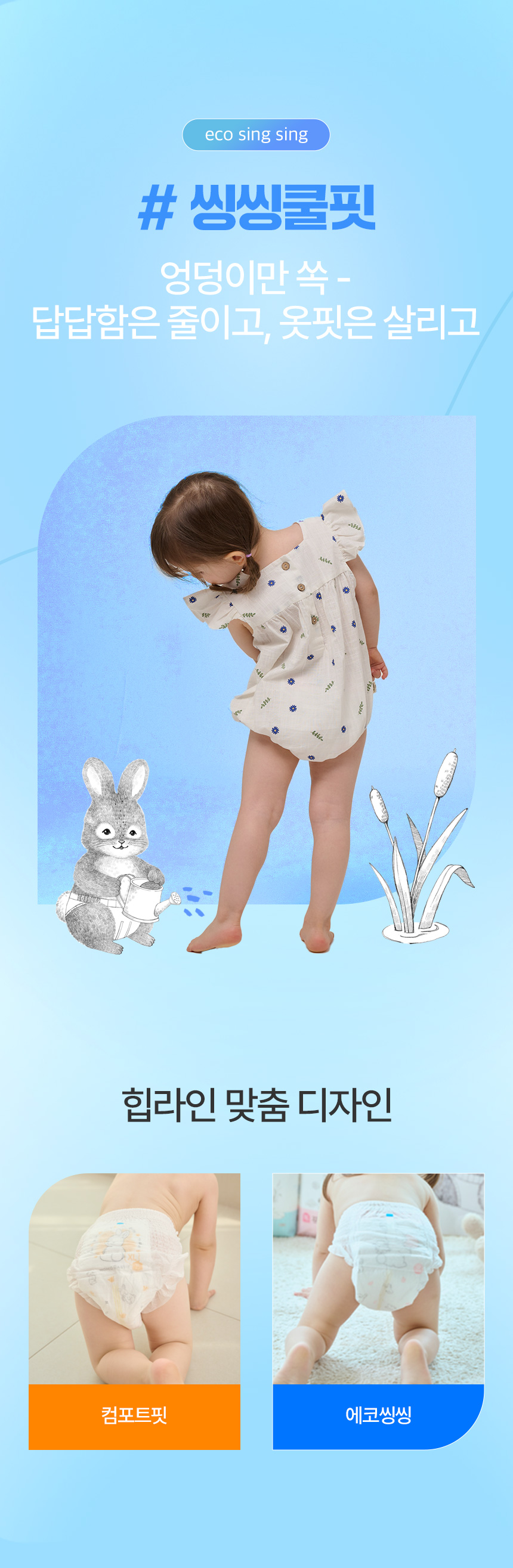 여름철에는 움직임이 많을수록 기저귀 내부 열감이 높아지는데, 에코씽씽은 가볍고 시원하게 착용 가능한 기저귀입니다.