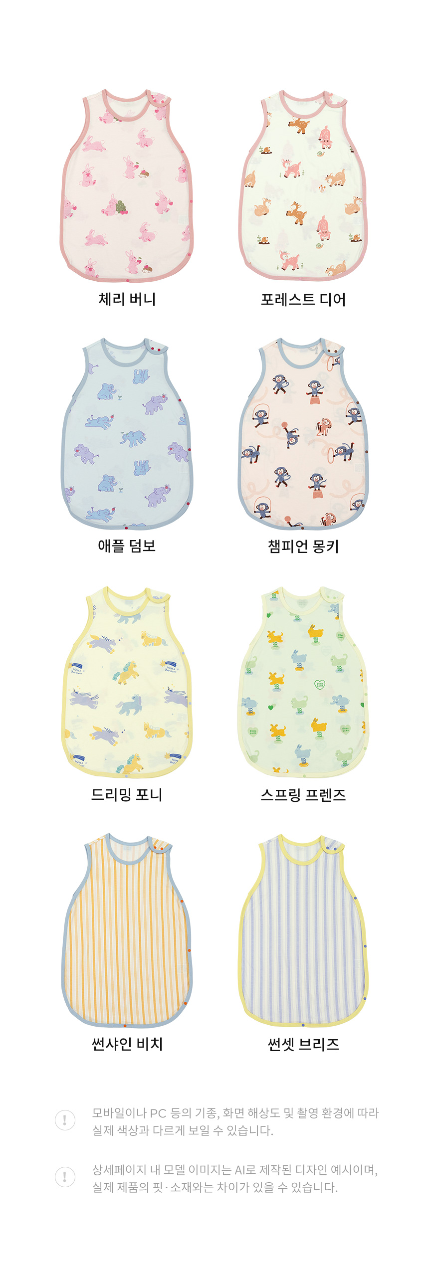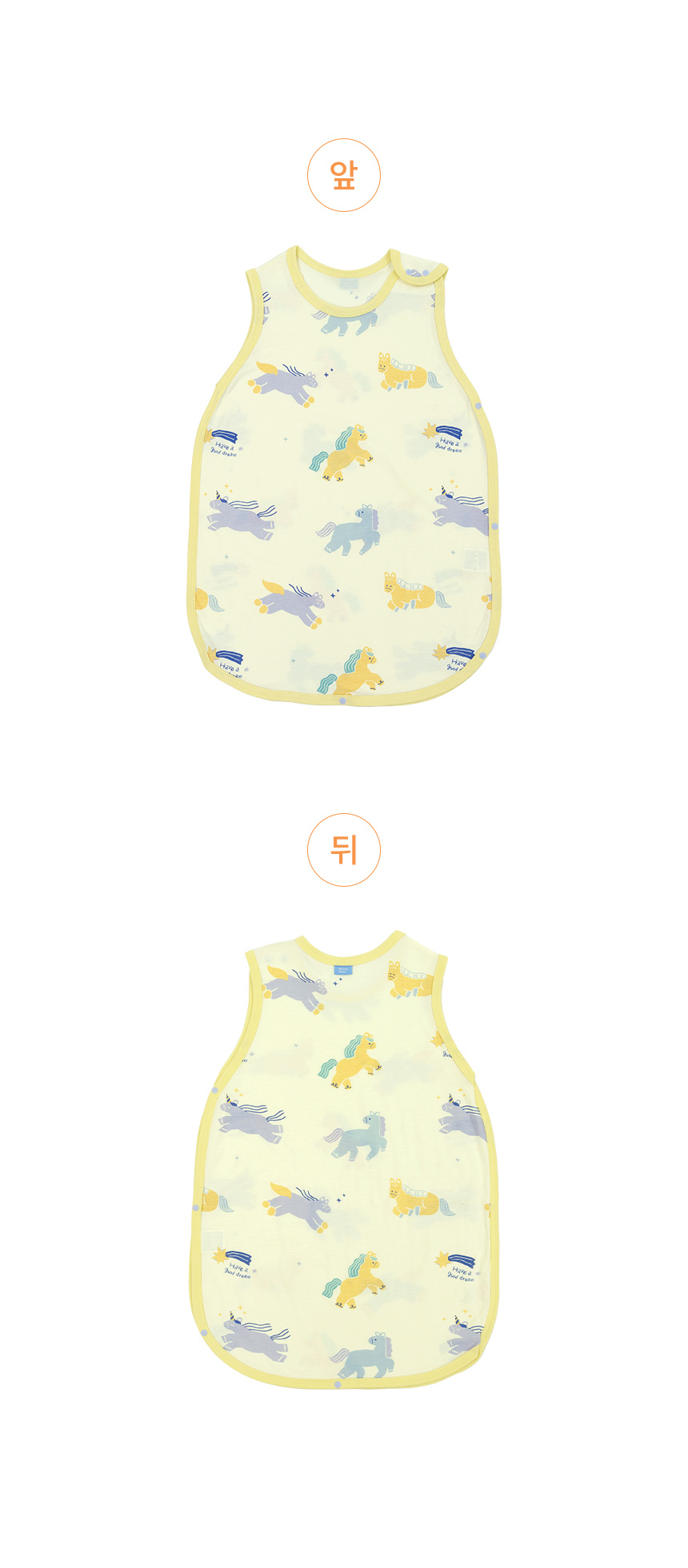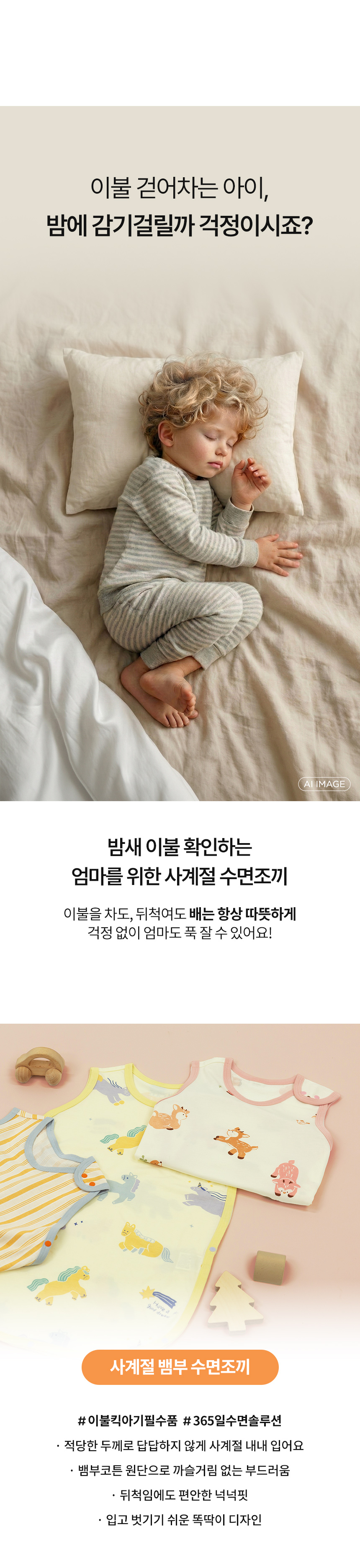 영유아는 수면 중 이불을 걷어차거나 뒤척임으로 옷이 올라가 배가 나오는 경우가 많습니다. 수면조끼는 이불이 벗겨져도 체온을 유지할 수 있도록 아이 몸에 직접 입히는 수면용 의류로, 배와 상체가 노출되는 것을 방지하는데 도움을 줄 수 있습니다. |