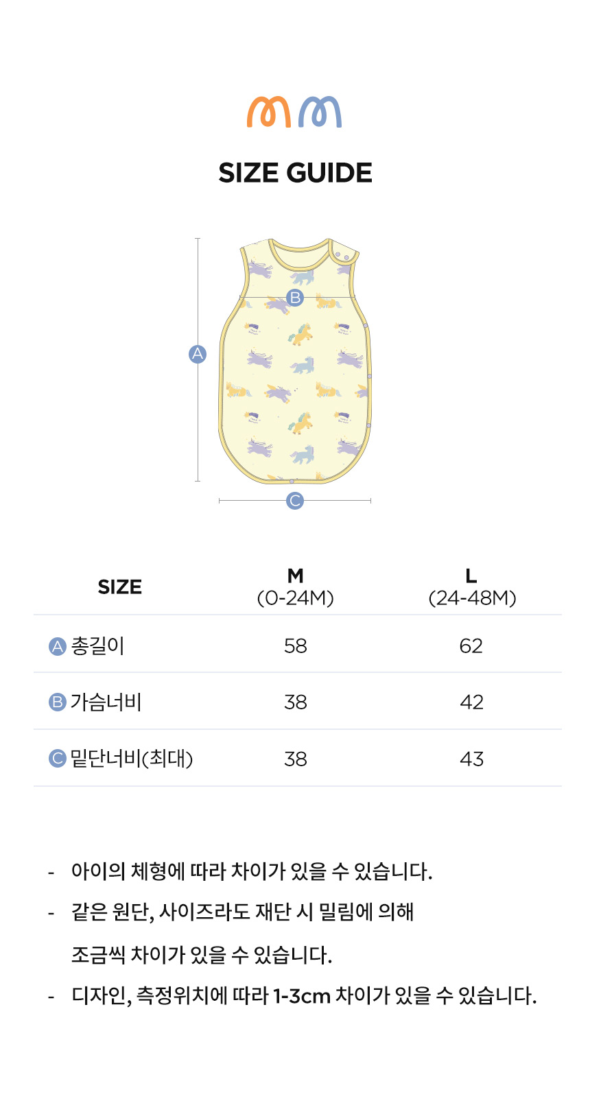 M 사이즈 : 총 길이 58cm, 가슴너비 38cm, 밑단너비(최대) 38cm L 사이즈 : 총 길이 62cm, 가슴너비 42cm, 밑단너비(최대) 43cm |